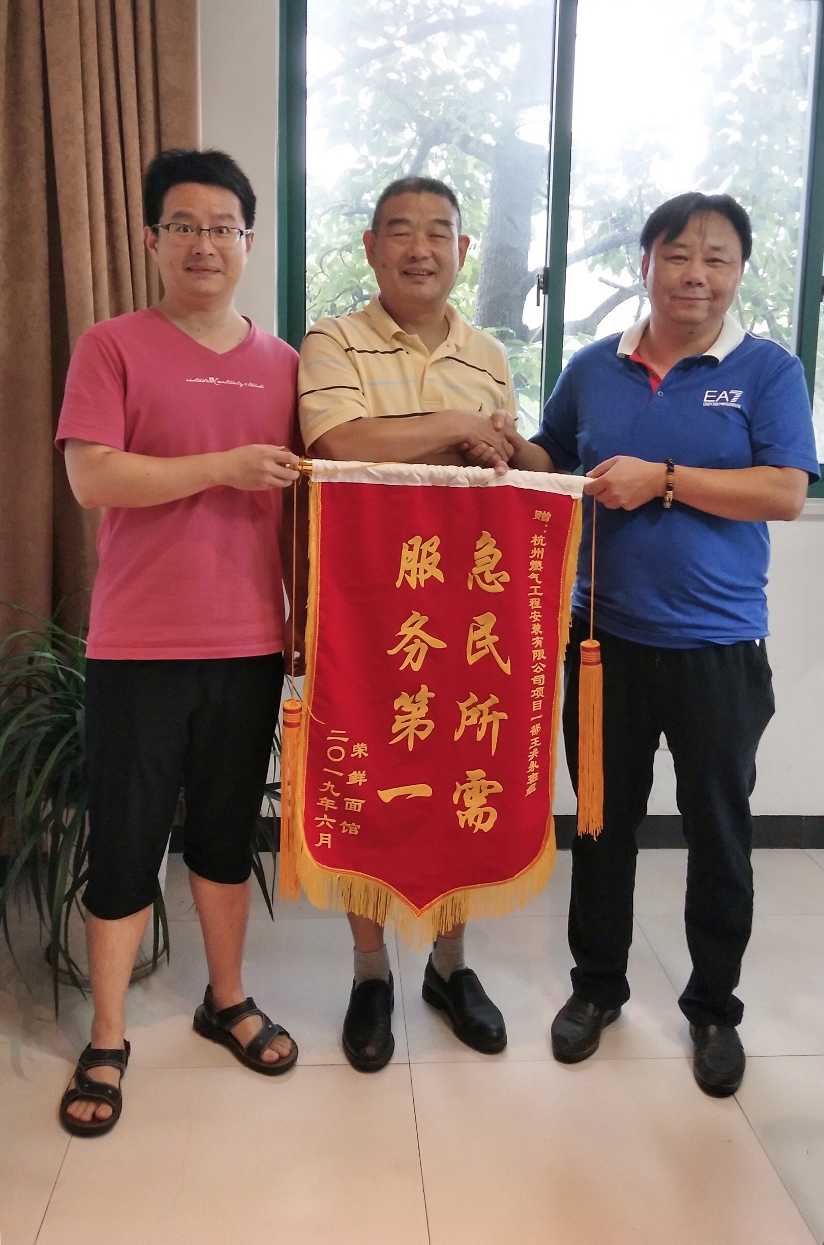 7月9日下午,上城區(qū)榮鮮面館老板宋前榮冒雨帶著錦旗“急民所需,服務(wù)第一”專程來到工程公司表示感謝,對工程公司項目一部專業(yè)、細致、高效、精益求精的施工服務(wù)給予了高度贊揚。工程公司副總經(jīng)理管志鴻代表公司感謝榮鮮面館對工作的支持和肯定。