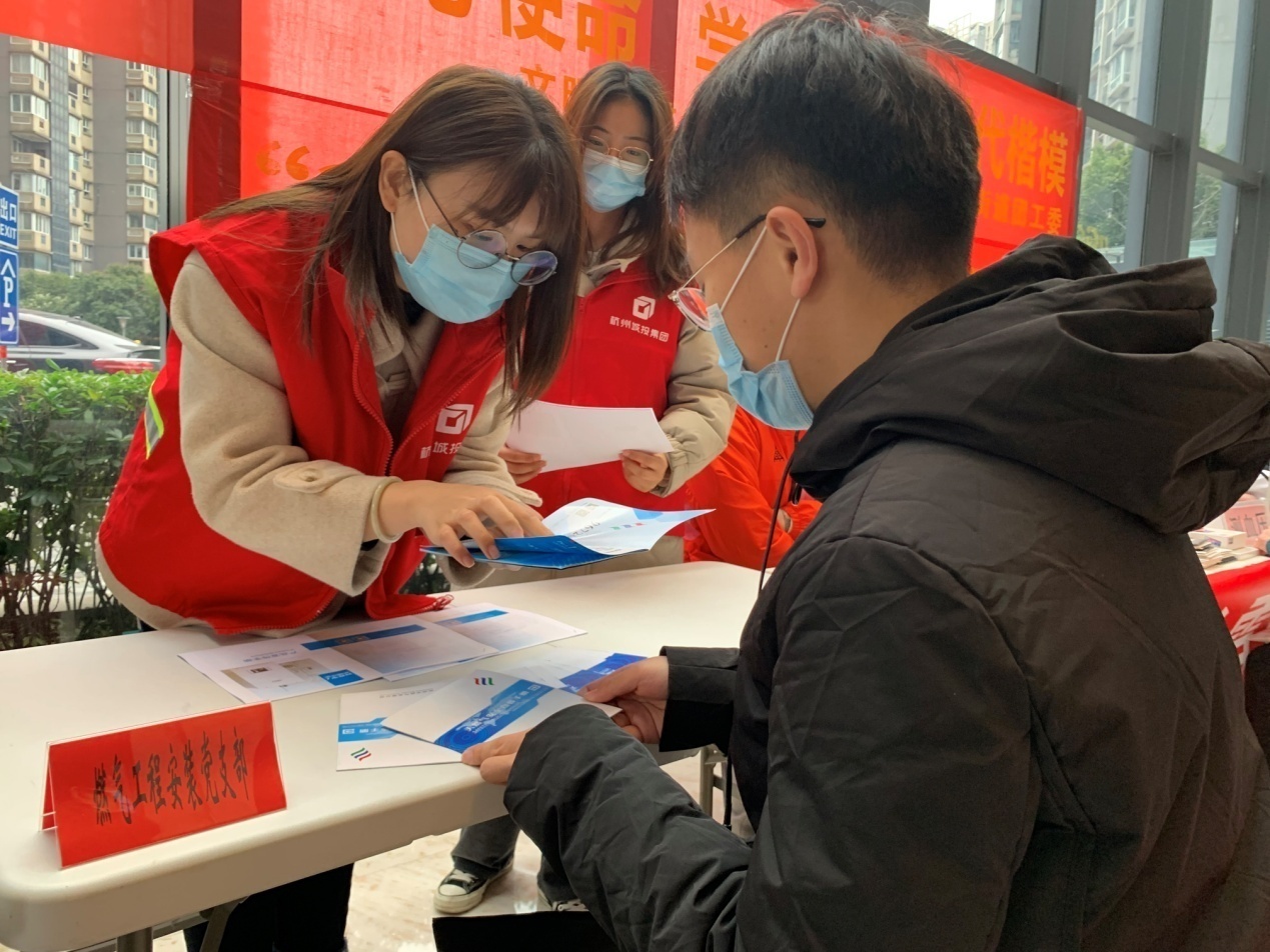 為弘揚(yáng)和傳承雷鋒精神,培養(yǎng)服務(wù)社會(huì)、服務(wù)百姓的優(yōu)良品質(zhì),在第58個(gè)學(xué)雷鋒日即將到來(lái)之際,作為浙江省文明單位、杭燃集團(tuán)全資子公司、民生保障單位以及下城區(qū)文暉街道屬地企業(yè),工程公司積極響應(yīng)下城區(qū)文暉街道江南樓宇社區(qū)黨委、文暉街道團(tuán)工委開(kāi)展的“觀黨史牢記使命初心,學(xué)雷鋒爭(zhēng)做時(shí)代楷!睂W(xué)雷鋒日主題活動(dòng)。3月3日中午,公司6名黨團(tuán)員、青年員工志愿者在做好疫情防控及自身保護(hù)的情況下,帶著天然氣安全宣傳手冊(cè)和杭燃優(yōu)家產(chǎn)品介紹冊(cè),來(lái)到野風(fēng)現(xiàn)代中心北樓一樓大廳,為樓宇企業(yè)員工分發(fā)手冊(cè),解答日常生活中遇到的燃?xì)獍踩≈R(shí)并宣傳推廣杭燃優(yōu)家系列產(chǎn)品,利用午休時(shí)間向樓宇內(nèi)的員工提供便民志愿服務(wù)。服務(wù)之余,志愿者們還參觀了活動(dòng)現(xiàn)場(chǎng)設(shè)立的中國(guó)共產(chǎn)黨歷屆全國(guó)代表大會(huì)的展板,學(xué)習(xí)了黨史內(nèi)容。