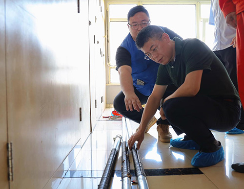 萬董察看了正處于立管施工階段的二樓住戶和已完成立管更換的十樓住戶家中情況,詢問了材質特性、耐久性能及施工規范等關鍵技術指標,并就施工方案的具體落實和居民反饋意見與現場人員進行交流。