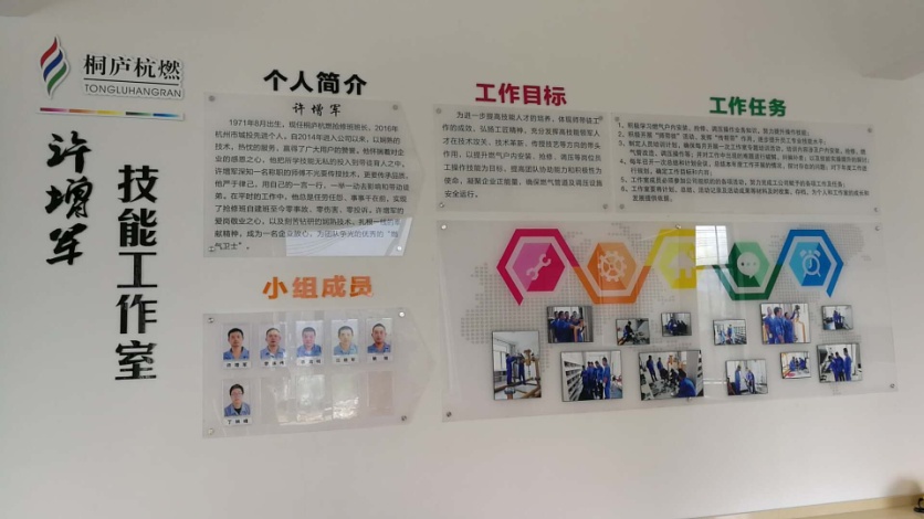 今年8月,桐廬杭燃終于有了自己的技能工作室,我們將其命名為“許增軍”技能工作室。自今年5月初籌建“許增軍技能工作室”以來,桐廬杭燃以弘揚工匠精神、技術攻關、技術革新、傳授技藝為目的進行建設。經過近2個月的奮戰,工作室終于在7月14日全部建設完成。培訓室面積約58平方,現有套絲機、調壓器、龍門架、灶具臺,樓調、電焊機、熱水器、電腦等培訓設施,可滿足10余人同時參加戶內安檢及調壓訓練,為企業的戶內安裝、優家產品安裝隊伍人才培養,員工技能提升搭建了良好的平臺。