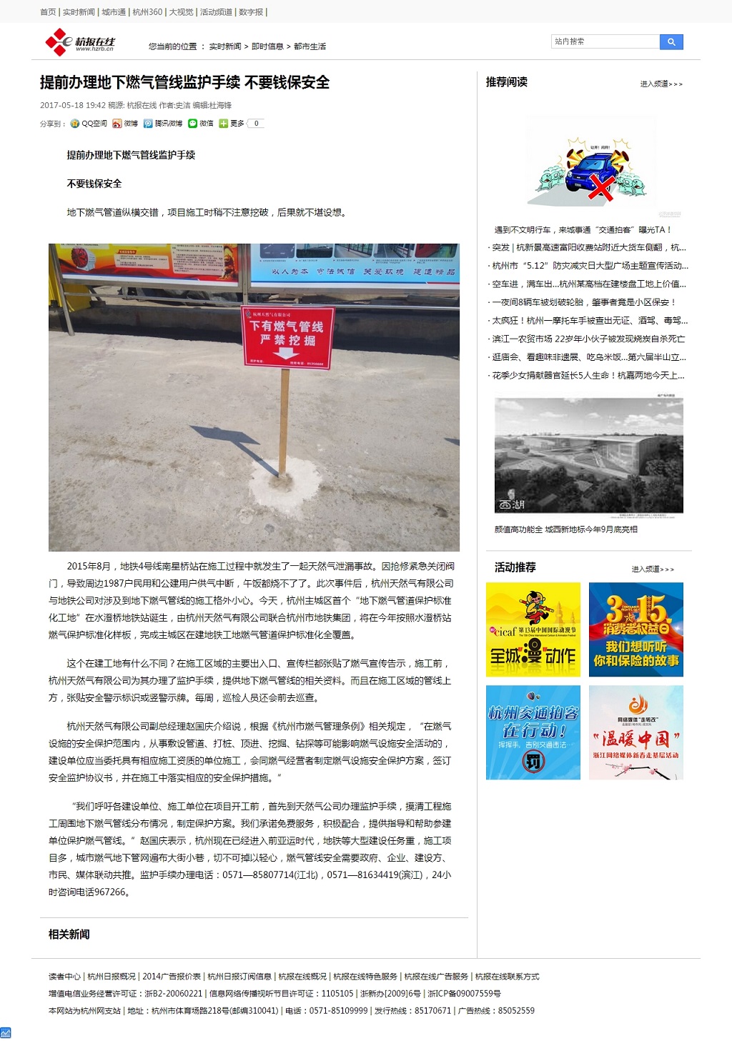 “我們呼吁各建設(shè)單位、施工單位在項(xiàng)目開(kāi)工前,首先到天然氣公司辦理監(jiān)護(hù)手續(xù),摸清工程施工周圍地下燃?xì)夤芫分布情況,制定保護(hù)方案。我們承諾免費(fèi)服務(wù),積極配合,提供指導(dǎo)和幫助參建單位保護(hù)燃?xì)夤芫。”趙國(guó)慶表示,杭州現(xiàn)在已經(jīng)進(jìn)入前亞運(yùn)時(shí)代,地鐵等大型建設(shè)任務(wù)重,施工項(xiàng)目多,城市燃?xì)獾叵鹿芫W(wǎng)遍布大街小巷,切不可掉以輕心,燃?xì)夤芫安全需要政府、企業(yè)、建設(shè)方、市民、媒體聯(lián)動(dòng)共推。監(jiān)護(hù)手續(xù)辦理電話:0571—85807714(江北),0571—81634419(濱江),24小時(shí)咨詢電話967266。