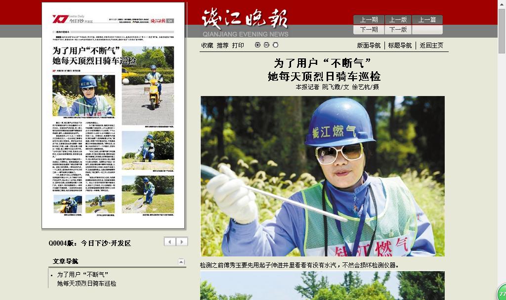 “對女工來說,進行燃氣閥門井泄漏點檢測、井內積水情況排查、管網安全距離內違章施工和違規占壓等隱患排查工作,相比男同志們在生理和心理上需要付出更大的艱辛。但傅秀玉不放過一切細節,巡檢時都會集中精神仔細檢查,以女性特有的耐心和細心來進行巡查工作,這是她愛崗敬業、無怨無悔奉獻精神的體現。”錢江燃氣一名工作人員這樣評價道。