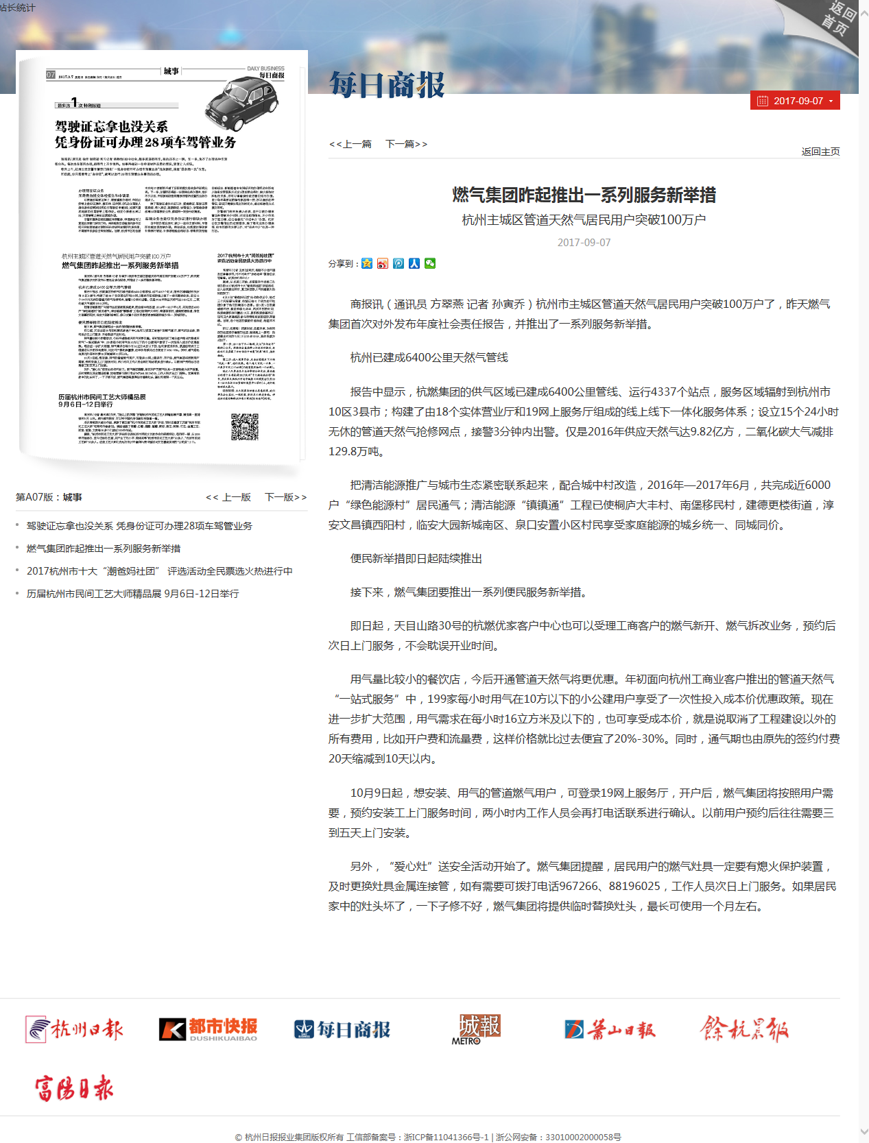 商報訊(通訊員 方翠燕 記者 孫寅喬)杭州市主城區管道天然氣居民用戶突破100萬戶了,昨天燃氣集團首次對外發布年度社會責任報告,并推出了一系列服務新舉措。