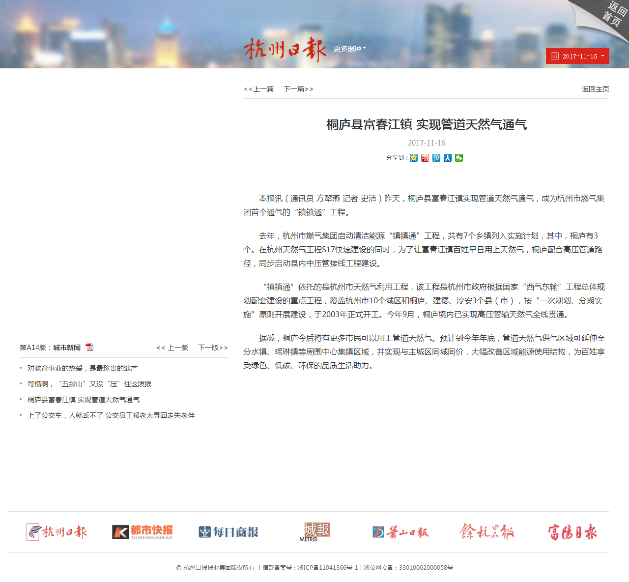 本報訊(通訊員 方翠燕 記者 史潔)昨天,桐廬縣富春江鎮實現管道天然氣通氣,成為杭州市燃氣集團首個通氣的“鎮鎮通”工程。