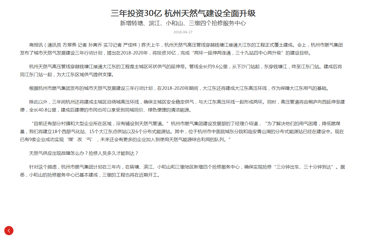 根據杭州市燃氣集團發布的城市天然氣發展建設三年行動計劃,在2018-2020年期間,大江東還將建成大江東高壓環線,作為保障大江東用氣的基礎。