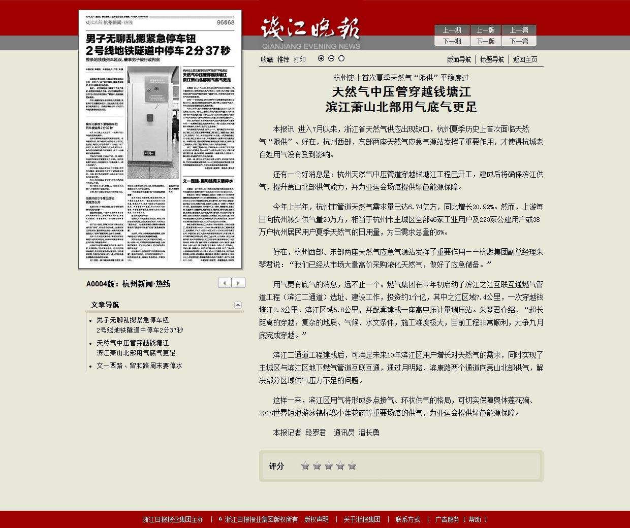 用氣更有底氣的消息,遠不止一個。燃氣集團在今年初啟動了濱江之江互聯互通燃氣管道工程(濱江二通道)選址、建設工作,投資約1個億,其中之江區域7.4公里,一次穿越錢塘江2.3公里,濱江區域5.8公里,并配套建成一座高中壓計量調壓站。朱琴君介紹,“超長距離的穿越,復雜的地質、氣候、水文條件,施工難度極大,目前工程非常順利,力爭九月底完成穿越。”