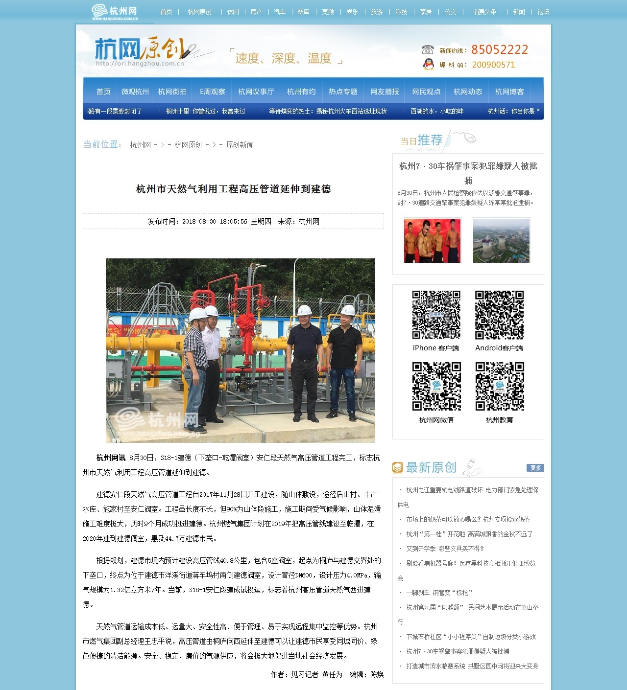 杭州網訊 8月30日,S18-1建德(下壟口-乾潭閥室)安仁段天然氣高壓管道工程完工,標志杭州市天然氣利用工程高壓管道延伸到建德。