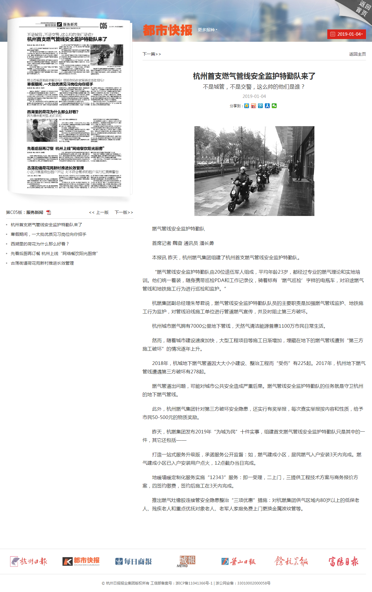 “燃氣管線安全監護特勤隊由20位退伍軍人組成,平均年齡23歲,都經過專業的燃氣理論和實地培訓。他們統一著裝,隨身攜帶巡檢PDA和工作記錄儀,騎著標有‘燃氣巡檢’字樣的電瓶車,對沿途燃氣管線和地鐵施工行為進行巡檢和監護。”