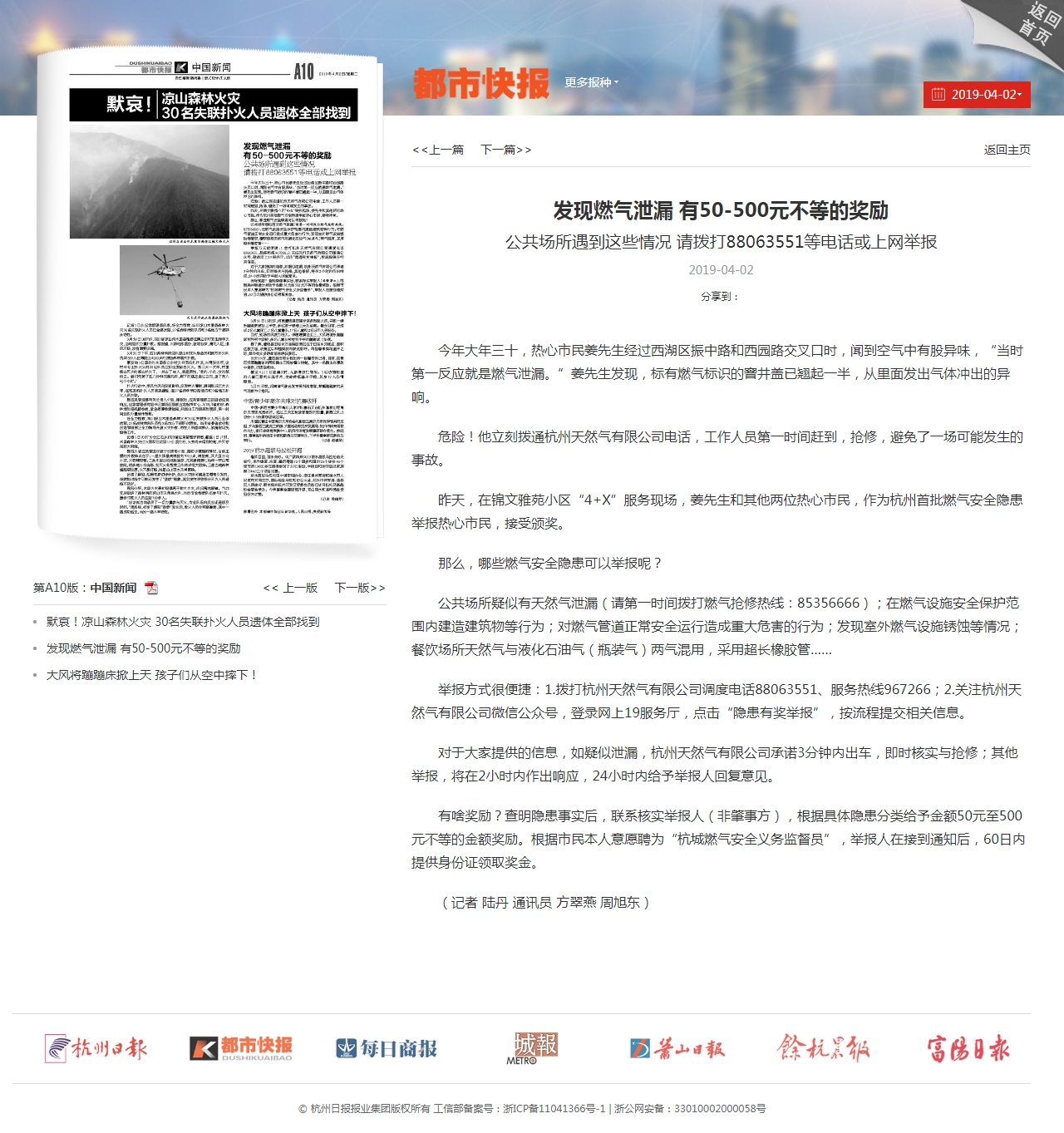 舉報方式很便捷:1.撥打杭州天然氣有限公司調度電話88063551、服務熱線967266;2.關注杭州天然氣有限公司微信公眾號,登錄網上19服務廳,點擊“隱患有獎舉報”,按流程提交相關信息。