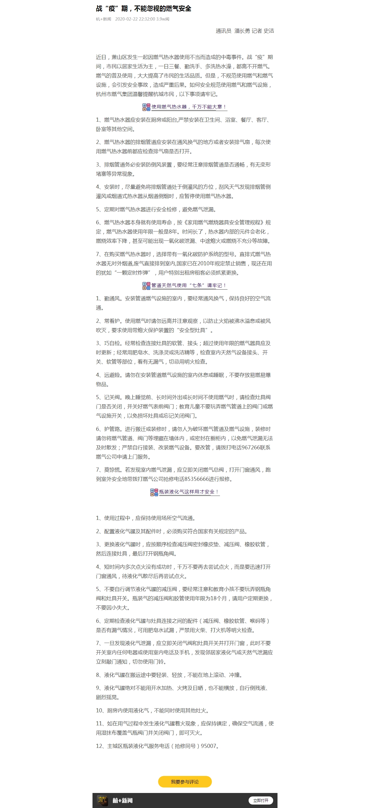 近日,蕭山區發生一起因燃氣熱水器使用不當而造成的中毒事件。戰“疫”期間,市民以居家生活為主,一日三餐、勤洗手、多洗熱水澡,都離不開燃氣。燃氣的普及使用,大大提高了市民的生活品質。但是,不規范使用燃氣和燃氣設施,會引發安全事故,造成嚴重后果。如何安全規范使用燃氣和燃氣設施,杭州市燃氣集團溫馨提醒杭城市民,以下事項請牢記。