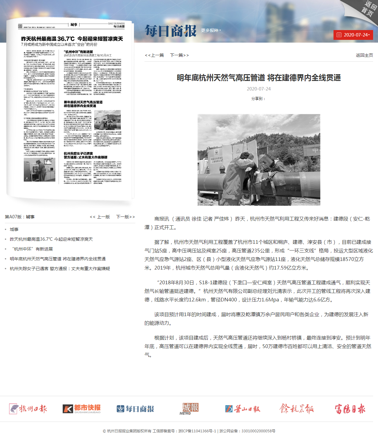商報訊 (通訊員 徐佳 記者 嚴佳煒) 昨天,杭州市天然氣利用工程又傳來好消息:建德段(安仁-乾潭)正式開工。