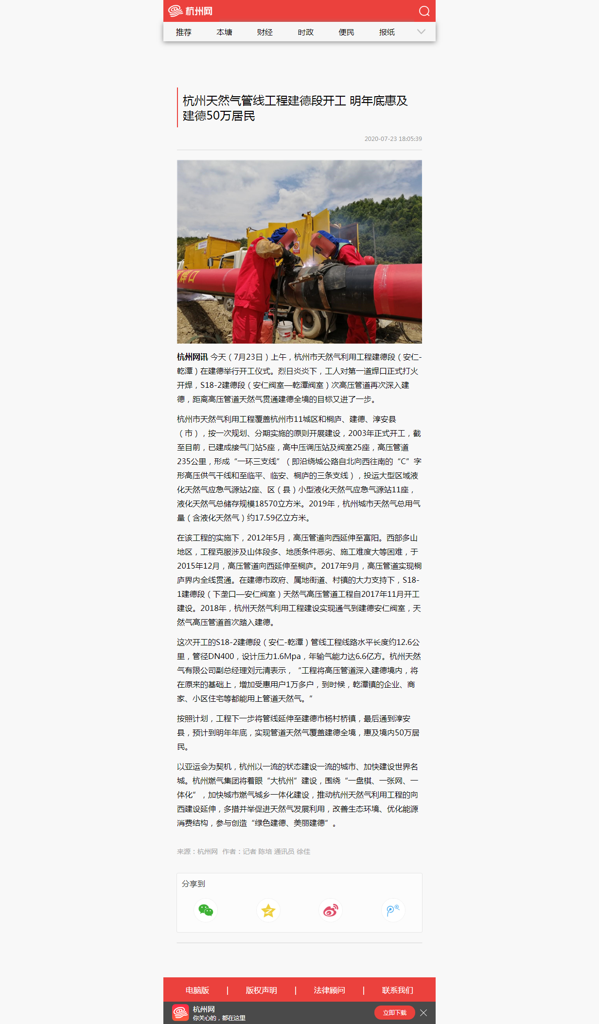 杭州網訊 今天(7月23日)上午,杭州市天然氣利用工程建德段(安仁-乾潭)在建德舉行開工儀式。烈日炎炎下,工人對第一道焊口正式打火開焊,S18-2建德段(安仁閥室—乾潭閥室)次高壓管道再次深入建德,距離高壓管道天然氣貫通建德全境的目標又進了一步。