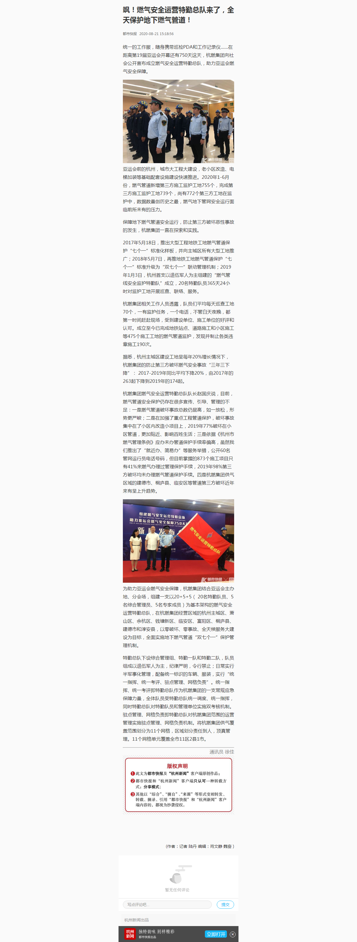 2017年5月18日,推出大型工程地鐵工地燃氣管道保護“七個一”標準化樣板,并向主城區所有大型工地推廣;2018年5月7日,再推地鐵工地燃氣管道保護“七個一”標準升級為“雙七個一”聯動管理機制;2019年1月3日,杭州首支以退伍軍人為主組建的“燃氣管線安全監護特勤隊”成立,20名特勤隊員365天24小時對監護工地開展巡查、聯絡、服務。