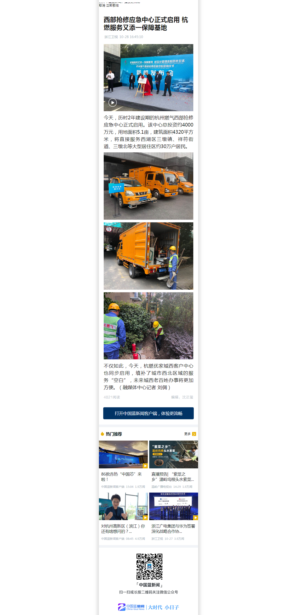今天,歷時2年建設期的杭州燃氣西部搶修應急中心正式啟用。該中心總投資約4000萬元,用地面積5.1畝,建筑面積4320平方米,將直接服務西湖區三墩鎮、祥符街道、三墩北等大型居住區約30萬戶居民。