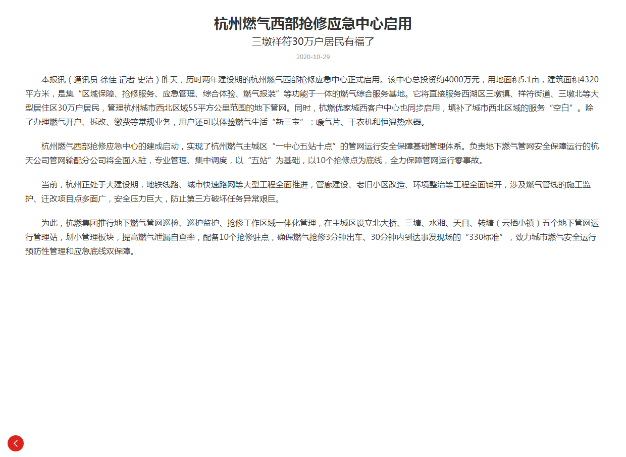 杭州燃氣西部搶修應急中心的建成啟動,實現了杭州燃氣主城區“一中心五站十點”的管網運行安全保障基礎管理體系。負責地下燃氣管網安全保障運行的杭天公司管網輸配分公司將全面入駐,專業管理、集中調度,以“五站”為基礎,以10個搶修點為底線,全力保障管網運行零事故。