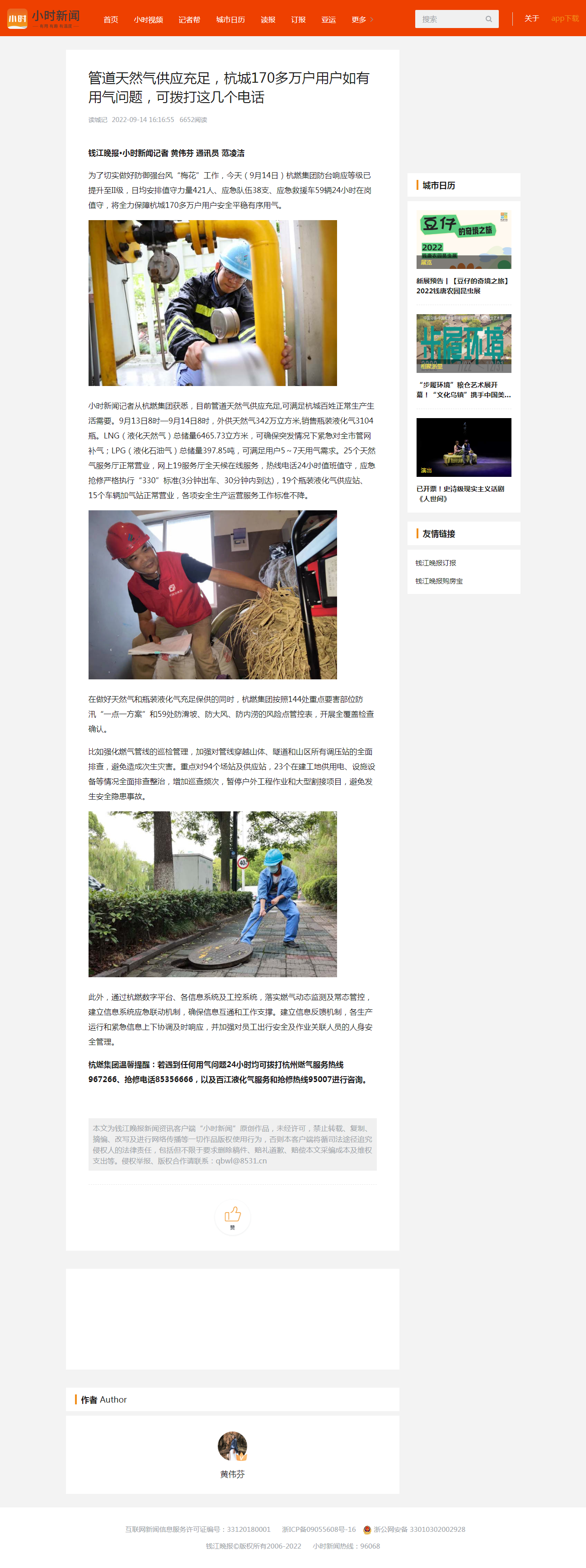 小時新聞記者從杭燃集團獲悉,目前管道天然氣供應充足,可滿足杭城百姓正常生產生活需要。9月13日8時—9月14日8時,外供天然氣342萬立方米,銷售瓶裝液化氣3104瓶。LNG(液化天然氣)總儲量6465.73立方米,可確保突發情況下緊急對全市管網補氣;LPG(液化石油氣)總儲量397.85噸,可滿足用戶5~7天用氣需求。25個天然氣服務廳正常營業,網上19服務廳全天候在線服務,熱線電話24小時值班值守,應急搶修嚴格執行“330”標準(3分鐘出車、30分鐘內到達),19個瓶裝液化氣供應站、15個車輛加氣站正常營業,各項安全生產運營服務工作標準不降。