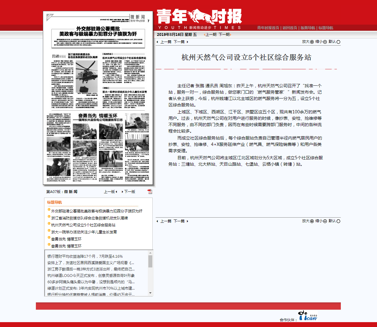 目前,杭州天然氣公司將主城區江北區域劃分為5大區域,成立5個社區綜合服務站:三塘站、北大橋站、天目山路站、七堡站、云棲小鎮(轉塘)站。