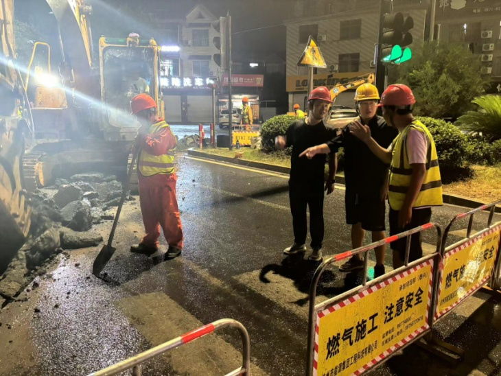 吳越街與杭徽高速管理中心接線工程位于杭徽高速玲瓏互通口,是臨安區(qū)的交通要道,全天車流量大,而G329建設(shè)施工又迫在眉睫,杭臨燃?xì)夥e極聯(lián)系臨安區(qū)交警大隊(duì)、玲瓏交警中隊(duì)進(jìn)行現(xiàn)場踏勘,多次優(yōu)化破道施工方案,9月12日完成道路施工審批。隨后施工員加班加點(diǎn)、緊盯項(xiàng)目進(jìn)度并協(xié)調(diào)各項(xiàng)工作,經(jīng)過連續(xù)四天的通宵奮戰(zhàn),9月26日完成吳越街與杭徽高速管理中心接線施工。