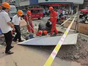 演練設(shè)定因挖掘機野蠻施工,導致燃氣管網(wǎng)破損,造成燃氣泄漏事故并有人員受傷。上午9點整,建德杭燃公司搶修熱線電話接到報警,稱壽昌中山路與東昌路交叉口疑似燃氣泄漏。巡檢人員立即趕赴現(xiàn)場,經(jīng)確認為燃氣泄漏,第一時間逐級上報,啟動應急預案,成立應急指揮部,并分組趕赴現(xiàn)場增援。所有公司人員及工程公司西域項目部搶修班在現(xiàn)場指揮的精心組織下,緊張有序地開展了關(guān)閉控制閥門、警戒疏散群眾、搶救傷員、防護作業(yè)、搶險搶修、修復破損管道、置換通氣、用戶服務等演練。