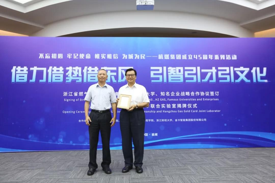 中燃協理事長劉賀明為香港中華煤氣有限公司行政總裁、港華燃氣有限公司董事會主席陳永堅頒發杭燃匠心學院名譽院長聘書。