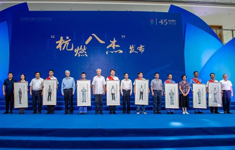 ▲朱金坤、蔡剛、胡征宇、范川、謝四海、何榮坤、陸瑞芬、謝勝才為“杭燃八杰”贈送八杰畫像